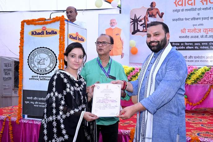 खादी और ग्रामोद्योग आयोग (केवीआईसी), सूक्ष्म, लघु एवं मध्यम उद्यम मंत्रालय के अध्यक्ष श्री मनोज कुमार ने उत्तर प्रदेश के शामली जिले के पंजोखरा में स्थिति चौधरी चरण सिंह बहुउद्देशीय प्रशिक्षण केंद्र में शुक्रवार को आयोजित एक कार्यक्रम में प्राकृतिक पेंट प्रशिक्षण यूनिट का उद्घाटन किया। इस अवसर पर उन्होंने 40 टर्नवुड क्रॉफ्ट मशीनों का वितरण कर, खादी कारीगरों के साथ ‘खादी संवाद’ किया।कारीगरों को संबोधित करते हुए उन्होंने कहा कि माननीय प्रधानमंत्री श्री नरेन्द्र मोदी के नेतृत्व में भारत की लोकल खादीग्लोबल ब्रांड बन चुकी है। खादी की उन्नति से खादी सेक्टर में कार्यरत लगभग 80 प्रतिशत महिलाओं के जीवन में क्रांतिकारी बदलाव आया है।